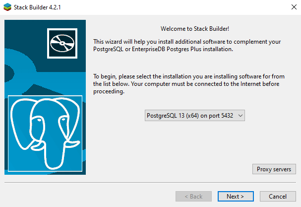 To enable some extended modules for processing spatial data, we also need to install the PostGIS extension for PostgreSQL. At the end of the PostgreSQL installation, the installer asks you whether StackBuilder (an extension manager) should be started. Click “Yes”. Next, you see a window where you need to choose the server you want to modify. Select the server you just installed from the dropdown list (it is likely the only one on the list). See the following screenshot:
