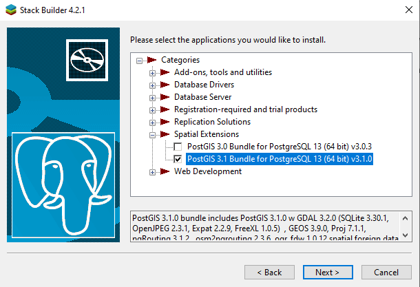 Continue with the installation, and StackBuilder will display a list of modules it can install for PostgreSQL. In this dialogue box, open “Spatial Extensions” and select the PostGIS bundle (we recommend selecting the highest version, but earlier versions will also work). Here is a screenshot: